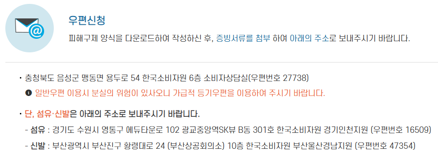 본원 : 충청북도 음성군 맹동면 용두로 54 한국소비자원 1층 방문상담실
